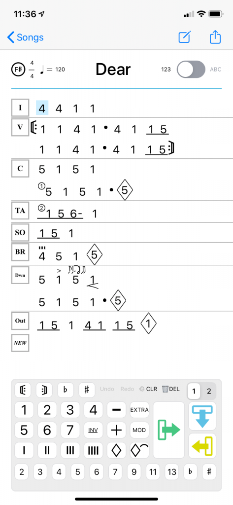 Switch between 123 and ABC chord viewing and notation.